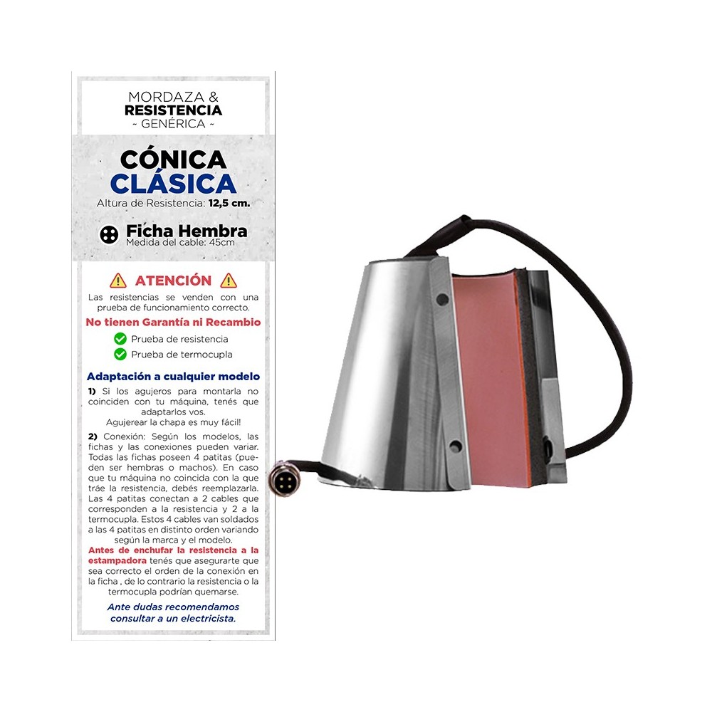 2) Conexión: Según los modelos, las fichas y las conexiones pueden variar. Todas las fichas poseen 4 patitas (pueden ser hembras o machos). En caso que tu máquina no coincida con la que trae la resistencia, tenemos ambos modelos para venderte (aparte). Las 4 patitas conectan a 2 cables que corresponden a la resistencia y 2 que corresponden a la termocupla. Estos 4 cables van soldados a las 4 patitas en distinto orden variando según la marca y el modelo. ANTES DE ENCHUFAR LA RESISTENCIA A LA ESTAMPADORA TENÉS QUE ASEGURARTE QUE SEA CORRECTO EL ORDEN DE LA CONEXIÓN EN LA FICHA, de lo contrario la resistencia o la termocupla podrían quemarse.