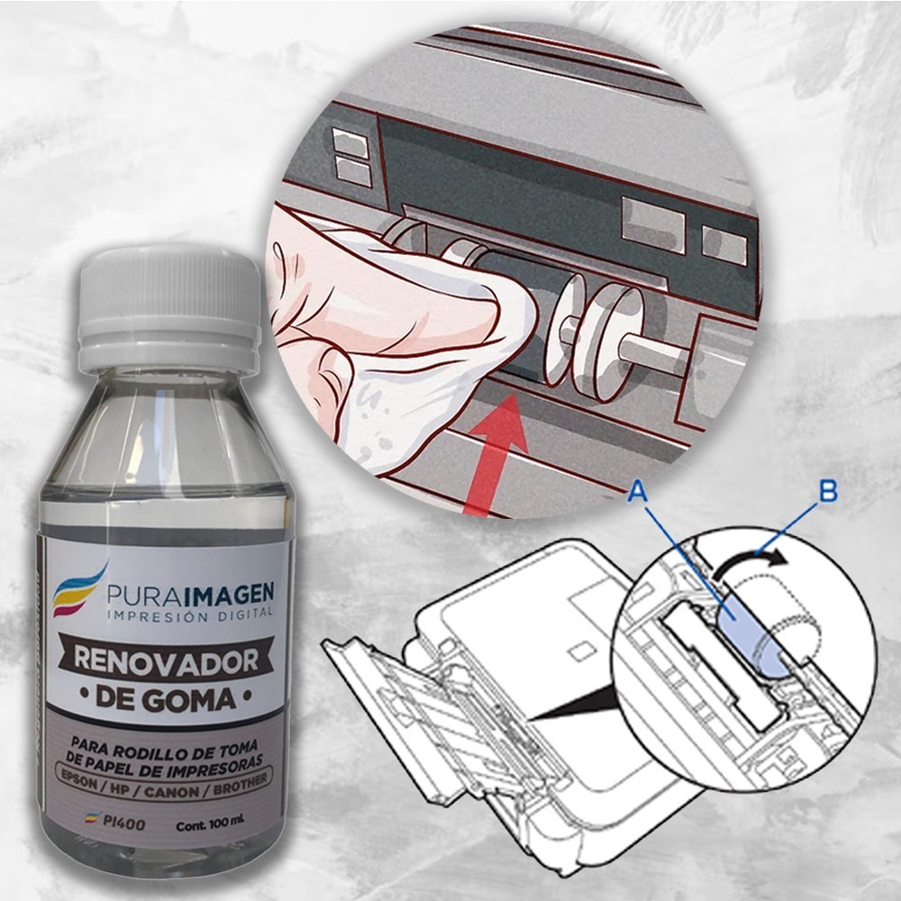La técnica para limpiar los rodillos de toma de papel de impresoras es tomar un paño de microfibra -que no deje pelusas- y humedecerlo en el líquido Restaurador Profesional. Luego identificar visualmente desde la ranura donde ingresa el papel, el rodillo con la goma (generalmente es de color gris o negro, y está en el centro, o sobre un costado). Luego, con el paño humedecido recubrir el dedo mayor, e ingresar la mano por la zona donde ingresa el papel y apoyar el dedo sobre el rodillo-goma. Luego, con la impresora encendida apretar el botón de papel para que la impresora intente tomar papel (el rodillo girará 2 o tres veces y de esa forma se limpiará todo el recorrido de la goma cilíndrica.