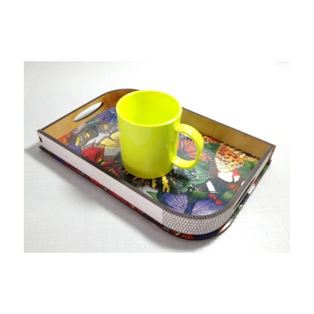 - Bandeja de MADERA, base Blanca. Con bordes y manijas encastrables. Espesor: 4 mm