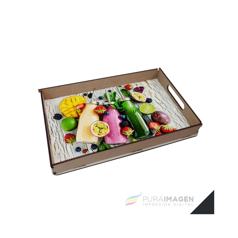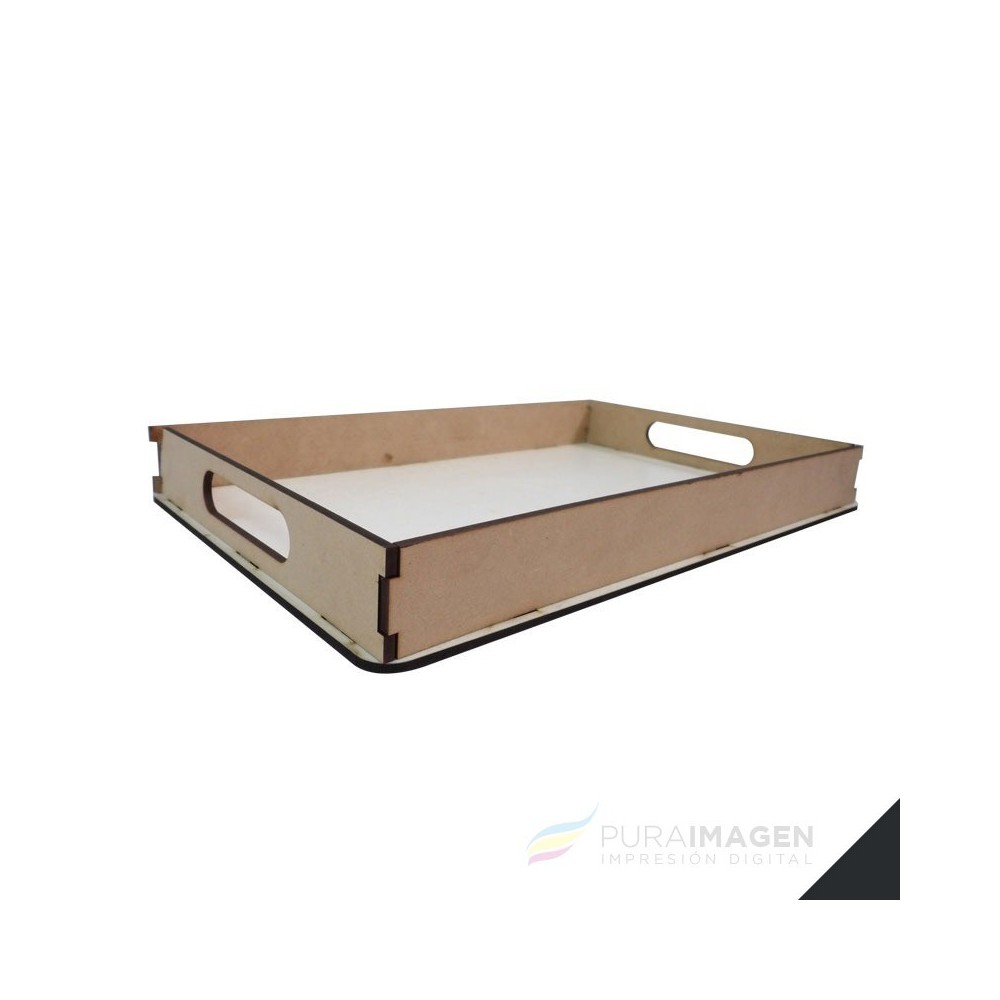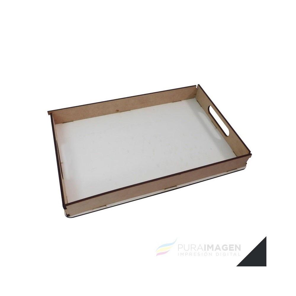 - Bandeja de MADERA, base Blanca. Con bordes y manijas encastrables. Espesor: 4 mm