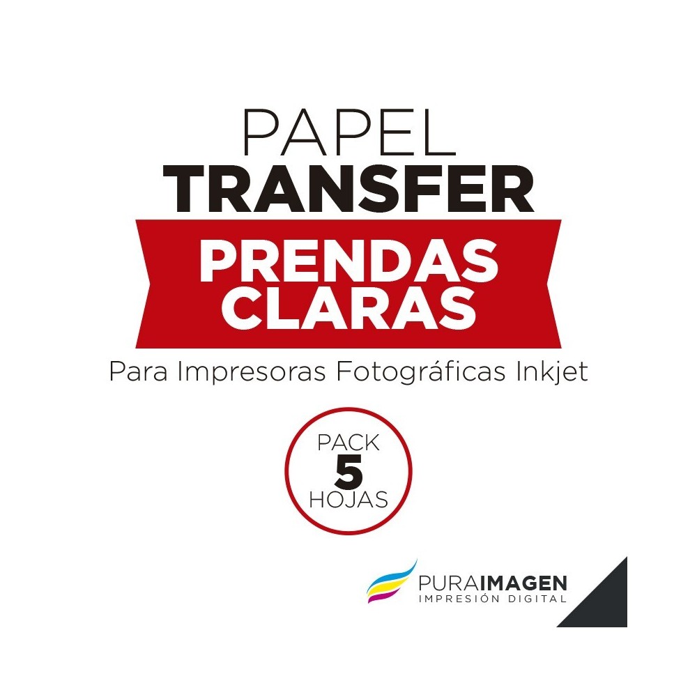 Presentación: Paquete de 5 Hojas tamaño A4. Imprimir la hoja de papel transfer con una impresora ink-jet (hogareña), cargada con tinta fotográfica (tinta común) y luego pegarlo con plancha a la remera (que debe ser de algodón). La textura final es la de una hoja (tipo agomada) no tan rígida, con una excelente definición de la imágen. Durabilidad: el papel queda firmemente pegado en la remera y no se despegará. La imágen también tendrá gran durabilidad si se utilizan tintas originales o alternativas de buena calidad.