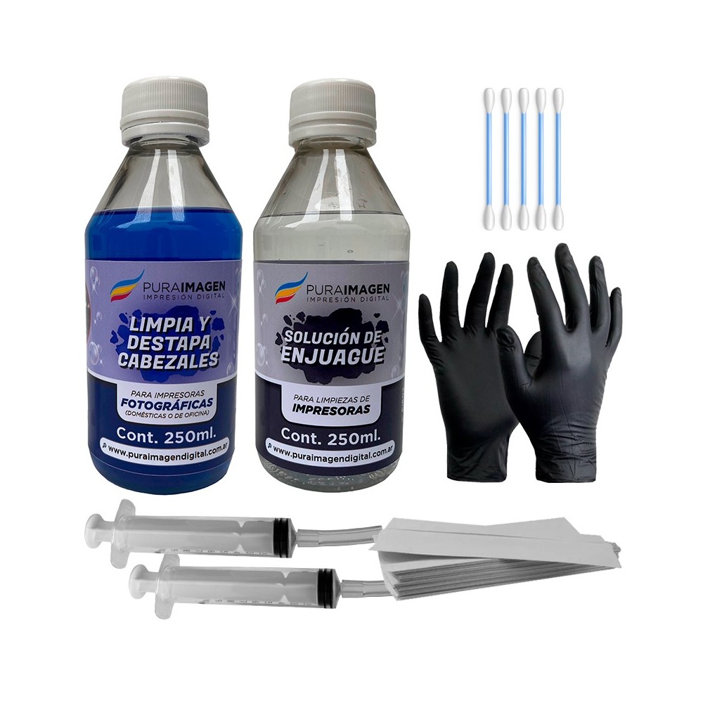Este kit incluye el líquido profesional para destapar y limpiar cabezales de impresoras y la soluición de enjuague para utilizar luego de aplicar el limpiador. Sirve para Epson, HP, Brother, Canon, etc, que se encuentran obstruídos por micro-partículas de tinta fotográfica que se han secado y comienzan a dar problemas a la hora de imprimir... algunos colores no imprimen, o salen mal los colores, o aparecen áreas de impresión mal impresas.