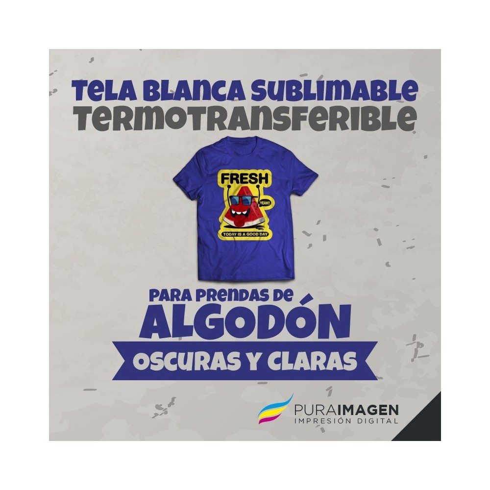- Tela con adhesivo base BLANCA para adherir y sublimar sobre prendas de algodón oscuras o claras. Terminación Brillante.