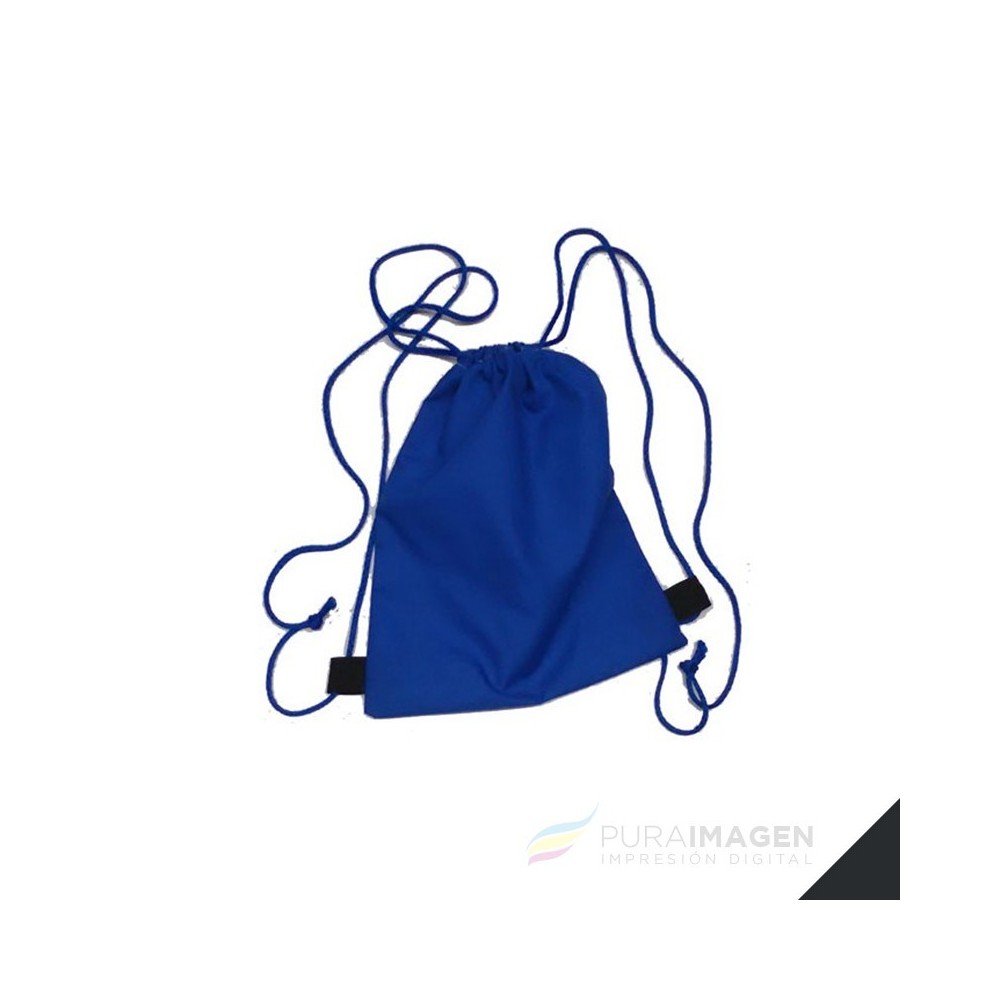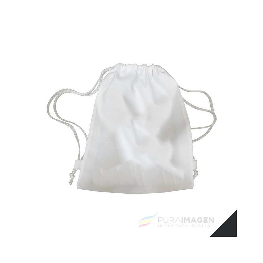 Mochililta de jardín frente blanca sublimable 100%, trasero azul. Cordón regulable. Tamaño de la mochila: 25x30 cm.