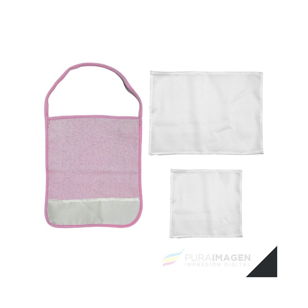 - 1 Toallita 1ra calidad tamaño 24x30cm con 2 bordes redondeados. Bordes y tirita colgante con bies al tono. Rectángulo blanco sublimable de  22x8cm