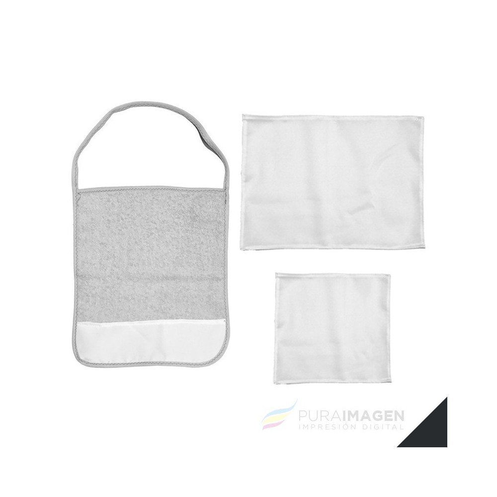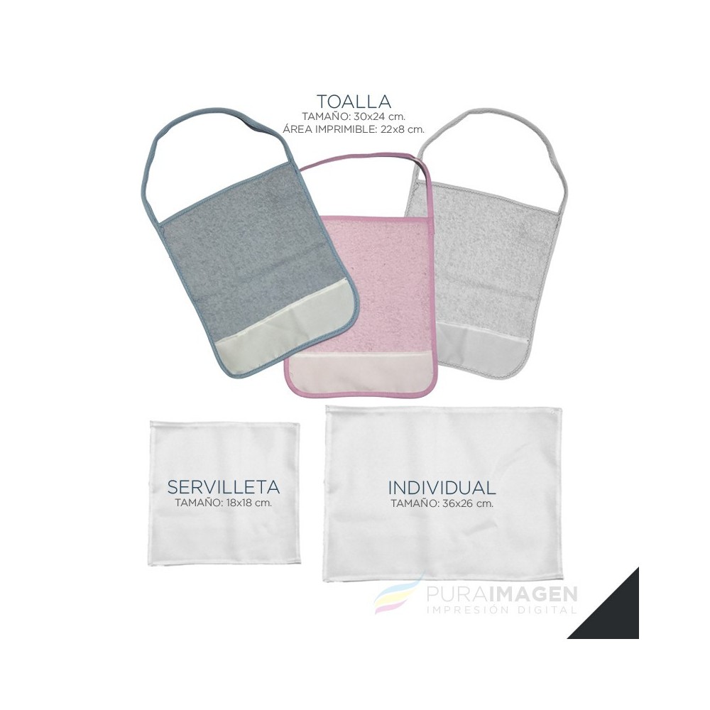 - 1 Toallita 1ra calidad tamaño 24x30cm con 2 bordes redondeados. Bordes y tirita colgante con bies al tono. Rectángulo blanco sublimable de  22x8cm